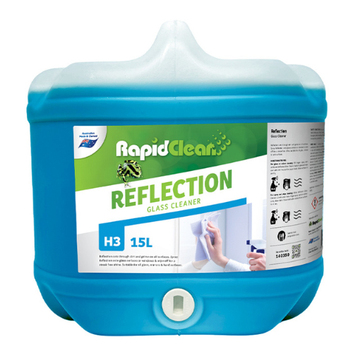 . RapidClean Reflection – Glass Cleaner is a clear blue liquid. It is a dual action, hard surface and window cleaner. It combines a powerful blend of detergents and degreasing agents to easily cut through grease and dirt while leaving a streak -free finish