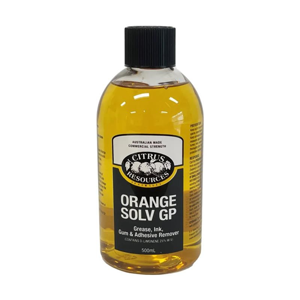 PRODUCT DESCRIPTION. Cut through tough grease, stains, and grime with Research Orange Solv GP 500ml, a powerful, water-soluble degreaser and solvent cleaner made from natural citrus-based ingredients. Designed as a safer, biodegradable alternative to petroleum and chlorinated solvents, this versatile formula is perfect for removing tar, oil, chewing gum, ink, adhesives, and graffiti from a wide variety of surfaces. Ideal for industrial, commercial, and institutional use, it rinses clean with water and leaves no sticky residue—only a fresh citrus scent. Orange Solv GP is tough on stains yet safe for use on engines, equipment, carpets, and hard surfaces alike