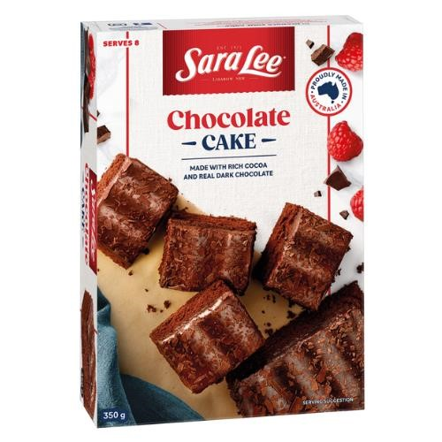 Sara Lee Cake Chocolate. Made with rich cocoa and real dark chocolate. Perfect for day or night... Our rich and moist chocolate cake is iced with a generous layer of smooth chocolate butter icing that is sprinkled with chocolate flakes. Australian made. No artificial colours or flavours. Halal certified. Contains: Wheat, Gluten, Milk, Soy, Egg and may contain traces of peanuts, almonds, hazelnuts, pecan and walnuts. Servings: Approx 8 serves. Size: 350g