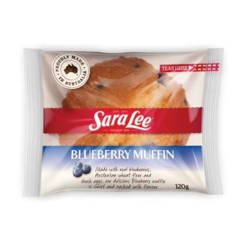 Sara Lee Individually Wrapped Blueberry Muffins are a 'must have' for your business. Made from real blueberries encased in a light vanilla sponge, Sara Lee Blueberry Muffins are a popular snack or light meal at any time of the day. Easy handling - simply thaw and display for sale for up to 5 days at room temperature. No artificial colours or flavours. Halal approved. Flavour: Blueberry. Size: 120g