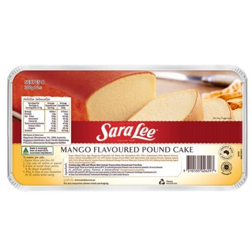 Sara Lee Pound Cake Mango. A Tropical Delight. Bring some flavour to the table with our Mango Flavoured Pound Cake. Moist and delicious. Australian Made. No artificial colours or flavours. Halal Certified. Contains: Egg, Milk and Wheat and may contain traces of Soy, Peanuts, and Tree Nuts. Flavour: Mango. Size: 300g