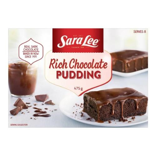 Sara Lee Pudding Chocolate. A chocolate pudding topped with a decadent dark choc sauce. We believe dessert is one of life's great pleasures. Inspired by patisserie-style recipes, our Chocolate Pudding is carefully crafted with real, quality ingredients for family and friends to share and enjoy. Serve with a scoop of our French Vanilla ice cream for an extra special treat. Australian Made. No artificial colours or flavours. Halal Certified. Contains: Egg, Milk, Wheat, Gluten and Soy, may also contain Peanuts, Almond, Hazelnut, Pecan and Walnuts. Flavour: Chocolate. Size: 475g