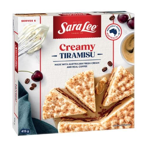 Sara Lee Tiramisu. Made with real coffee and fresh Australian cream. An Italian classic. Our creamy Tiramisu is made with real coffee, swirls of chocolate and fresh Australian cream, served on a scrumptious chocolate biscuit base. Australian Made. No artificial colours or flavours. Made with real coffee. Contains: Milk, Wheat, Gluten and Soy, may also contain traces of Egg, Peanut, Almond, Hazelnut, Pecan and Walnuts. Flavour: Tiramisu. Size: 415g