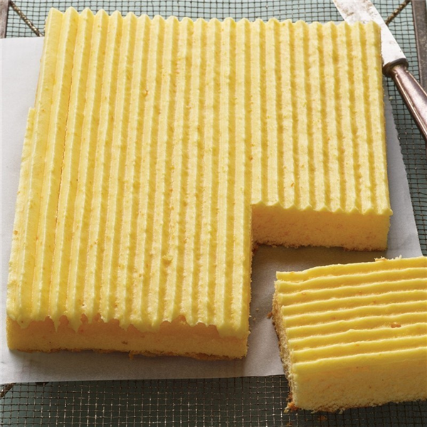 Sara Lee Orange Tray Cake. The refreshing citrus flavour and aroma of fresh oranges characterise our Orange Cake. Made with whole eggs, wheat flour, real butter and fresh oranges that we crush and mash ourselves to create a succulent orange puree batter. Our Orange Cake is finished with an irresistible orange icing to satisfy the sweet tooth in you. No artificial colours, flavours or preservatives. Halal approved.