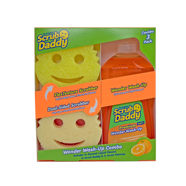 Scrub Daddy Wonder Wash-Up Combo is a complete washing-up bundle that pairs Scrub Daddy’s iconic scrubbers with their first-ever dishwashing liquid. The pack includes a bottle of Wonder Wash-Up liquid and two matching tools: Scrub Daddy Original and Scrub Mommy Pink. Wonder Wash-Up is a high-performance, zesty orange-scented formula that cuts through grease and grime with ease, while Scrub Daddy and Scrub Mommy bring FlexTexture® and ResoFoam® cleaning power to your sink. Safe on most household surfaces and vegan-friendly, this combo delivers fast, effective cleaning with a fun, colourful twist.