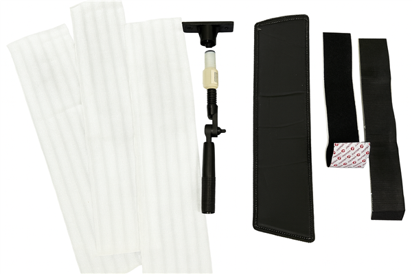 Includes a specialised adaptor plate, velcro backing system and microfibre cleaning pads engineered to safely conform to flat and recessed lens housings.