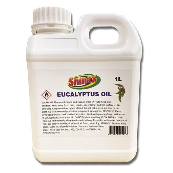 Shinax Eucalyptus Oil. 85% Oil. Treat as flammable liquid. Size: 1L