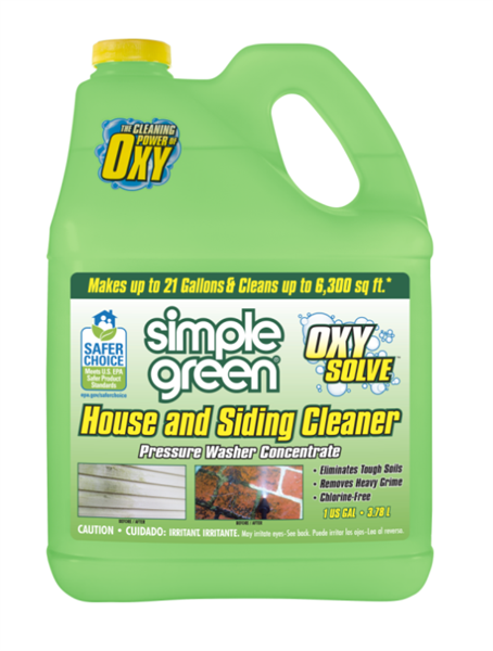 Simple Green Oxy Solve House and Siding Cleaner. This powerful, peroxide-based formula effectively removes dirt, pollution, and tough stains caused by mold, mildew, moss, and algae, leaving your siding clean and refreshed. Designed for use with a pressure washer, this biodegradable, non-toxic cleaner meets the U.S. EPA’s Safer Choice standards, ensuring it won’t harm plants, lawns, pets, or wildlife.