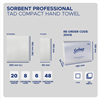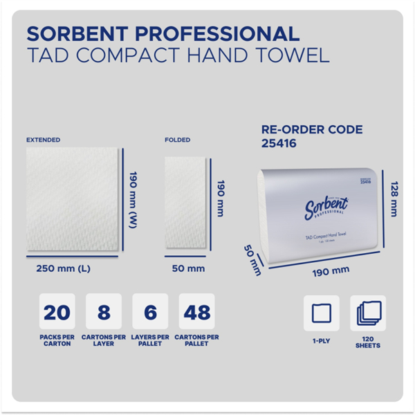 PRODUCT DESCRIPTION. Sorbent Hand Towel Compact is crafted from premium TAD paper, delivering superior absorbency and strength whether wet or dry. Specially selected paper fibres interlock to create a sponge-like structure for maximum performance, ensuring reliable drying with fewer sheets. Designed for easy use in compact dispensers, these towels are a cost-effective choice for high-traffic washrooms while maintaining quality and durability. PEFC certified, they support sustainable forest management and responsible sourcing