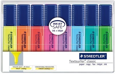 Staedtler textsurfer classic even performs perfectly on inkjet print-outs, without smudging the ink, its violet and turquoise colours are truly amazing too, with highlights still remaining visible after photocopying. | Highlighter with large ink reservoir for extra-long highlighting performance | Inkjet safe - does not smudge inkjet printouts and handwritten texts | Copy proof - violet and turquoise for documents which are to be copied | For paper, fax and carbon copies | Fast-drying | Twist cap