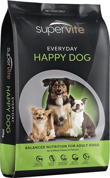 Supervite Happy Dog. Nutritionally formulated for active dogs. Infused with meat for muscles. Developed with beef pulp for digestion. Contains Omega 3 & 6 for skin and coat. Natural antioxidants. Australian Made. Size: 4kg
