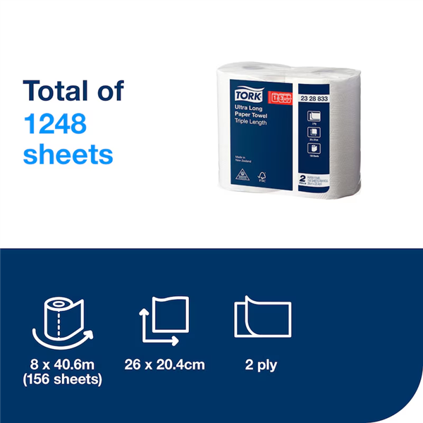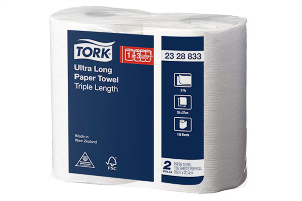 . Triple length rolls last three times longer than standard towels. Strong 2 Ply 3D pattern weave for superior absorbency and durability. Bulk carton with 8 packs (16 rolls) reduces restocking. Premium quality, proudly made in New Zealand