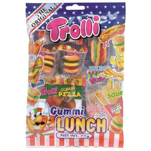. Our Trolli Gummi Lunch Bag includes 2x burgers, 1x pizza, 1x coke bottle, 1x hotdog & fries!. Size: 77G. Quantity: 1 pack