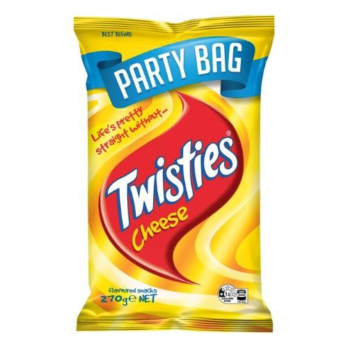 . Twisties Cheese are a crunchy, irresistible cheesy snack. Perfect to share at parties or get-togethers, life is pretty straight without...Twisties. Australian Made. Flavour: Cheese. Size: 270g