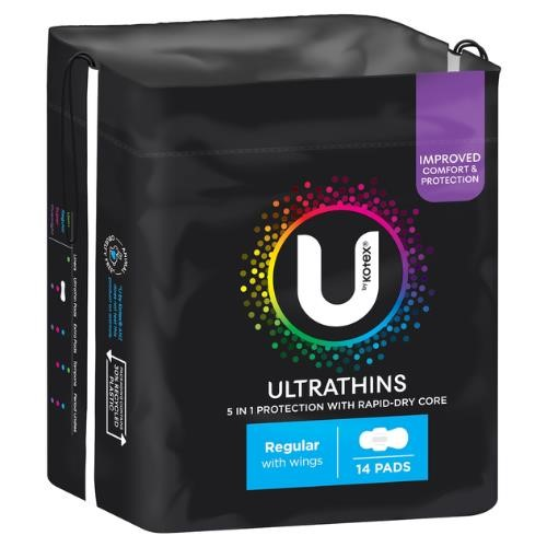 . U by Kotex(R) Ultrathin Regular Pads with wings have with Rapid-Dry Core™ for freshness and an ultra-soft top layer for comfort. Their discreet, ultra-thin design feels like wearing nothing at all. Size: Regular. Quantity: 14 pack