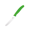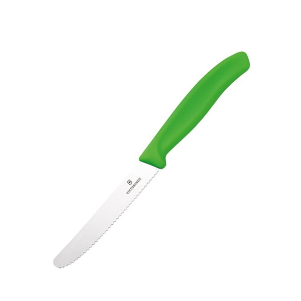 The curved end of this hardened stainless steel serrated knife gives that extra leverage for orange or lime peel and lets you cut through the delicate peel of an apricot or the tough skin of a sausage. This Swiss made blade is dishwasher safe and comes with a lifetime warranty. Key Features: Stainless Steel serrated blade with round tip. Ergonomic moulded handle. Dishwasher safe. Made in Switzerland. Lifetime warranty.