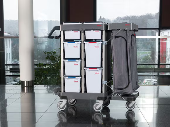 – ideal when mixed tasks (floor, surfaces, washrooms) are handled by one cart.