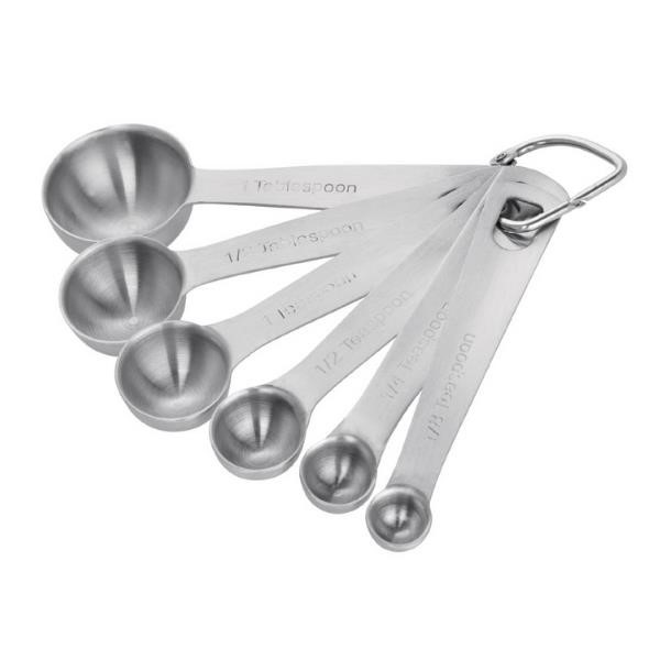 Follow recipes with great accuracy, thanks to this set of six high quality measuring spoons from Vogue. Including 1/8, 1/4, 1/2, 1 teaspoon, 1/2, and 1 tablespoon, the set helps you portion out each amount quickly and easily, giving you precise measurements in no time at all. Crafted from stainless steel, the spoons are incredibly robust and designed to last, allowing them to cope with constant use in any domestic or professional kitchen. The stainless steel construction also makes the spoons exceptionally easy-to-clean, helping you keep them hygienic and in superb condition at all times. Contents: 1/8, 1/4, 1/2, 1 teaspoon, 1/2, 1 tablespoon.