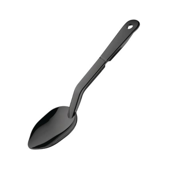 Incredibly durable and robust, this Vogue serving spoon will help you serve all kinds of ingredients quickly and easily. Made from polycarbonate for high heat resistance, the 29cm spoon features an ergonomic handle that remains cool and comfortable in the hand at all times - this comfort helps you serve with precision to create impeccable plate presentations. Designed with a convenient hole in the handle, the spoon can be hung up for quick access during service. High heat resistance. Comfortable handle. Reliable and highly durable. Hole in handle for easy storage. Dimensions: 290mm (L). Material: Polycarbonate. Weight: 40g