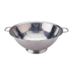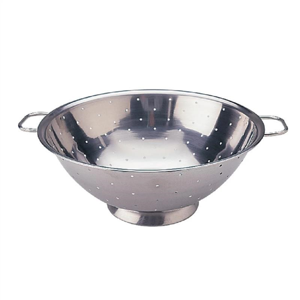 Drain or dry large quantities of ingredients with ease. Using this 35cm stainless steel colander from Vogue will save time and effort - designed with two robust handles, it is easy to lift and shake. From drying freshly washed vegetables to draining cooked pasta or rice, the basin holes will filter out any excess liquid quickly and efficiently. Alternatively, use the ridged base stand to place the colander in pots or pans instead. Perfect for washing and draining vegetables. Two large handles. Easy to move and shake. Strong and robust design. Easy to clean. Dimensions: 134mm (H) x 355mm (Ø). Material: Stainless Steel. Weight: 570g