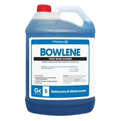 . Whiteley Bowlene is a concentrated phosphoric acid toilet bowl cleaner designed to rapidly penetrate and remove the most difficult hard water stains. Unique 3-in-1 action. Removes rust, scale, toilet stains and algae growth. Eliminates odour causing bacteria. Size: 5L
