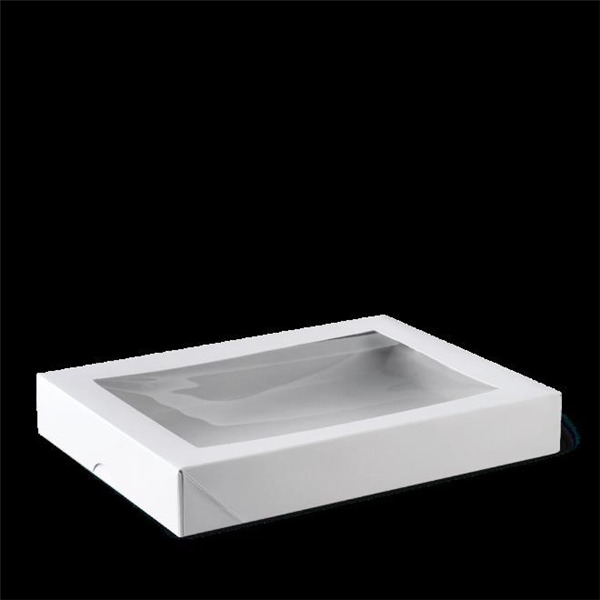 The window patisserie range features a large window to show off cakes, pastries and other bakery items. The Flat Box is ideal for treats such as biscuits, confectionary and Christmas mince pie. A light claycoat provides protection against grease. It is offered in white, and is ideal for branding.