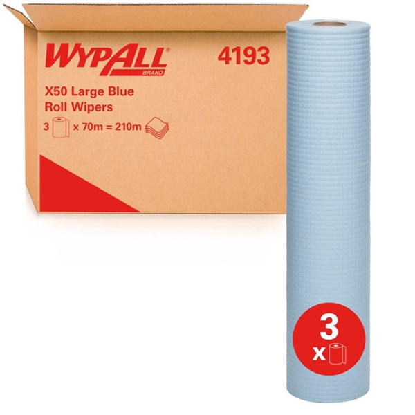 • The Wypall X50 Large Wiper Blue 70m are high-performance, reinforced large-format roll wipers designed for general-purpose wiping, spill cleaning and surface maintenance.