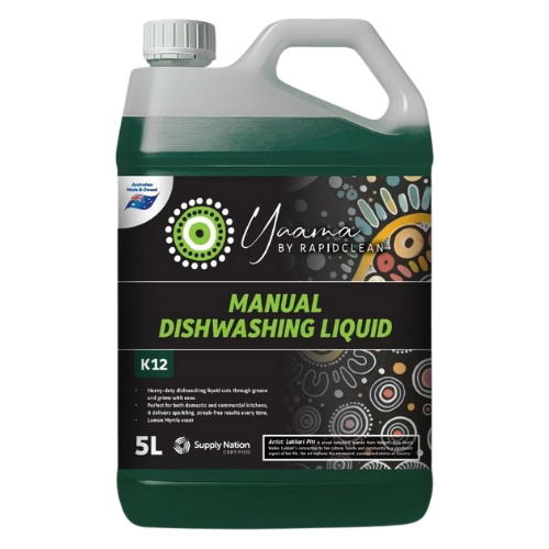 Harnessing the natural freshness of Lemon Myrtle, RapidClean Yaama heavy-duty dishwashing liquid cuts through grease and grime with ease.